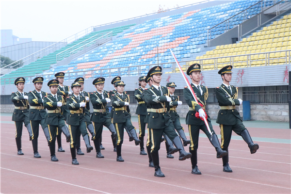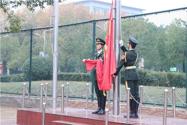 在晨曦微露的时刻,国旗护卫队队员迈着铿锵有力的步伐护送国旗进场。在雄壮的国歌声中,全体师生深情注目,五星红旗冉冉升起,迎风飘扬。