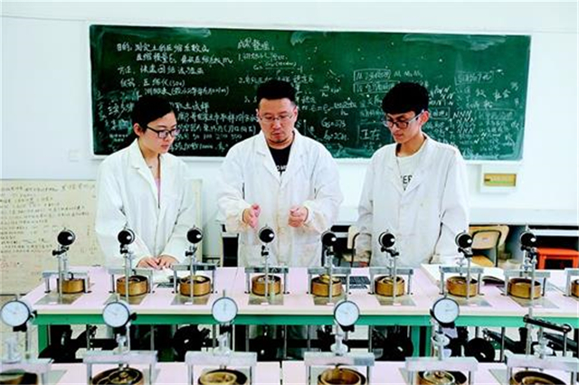图为:土木工程与建筑学院教师潘登带领学生做实验。﹙宣传部 陈剑争摄﹚