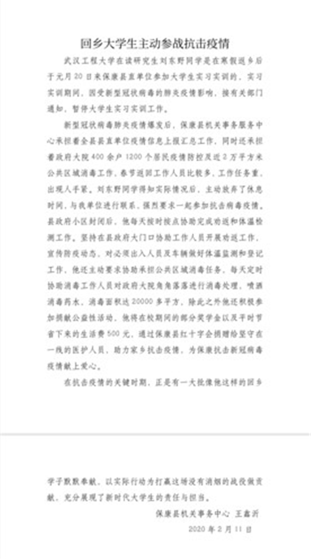 刘东野同学充分展现了新时代大学生的责任与担当,用实力行动助力家乡打赢疫情防控狙击战!