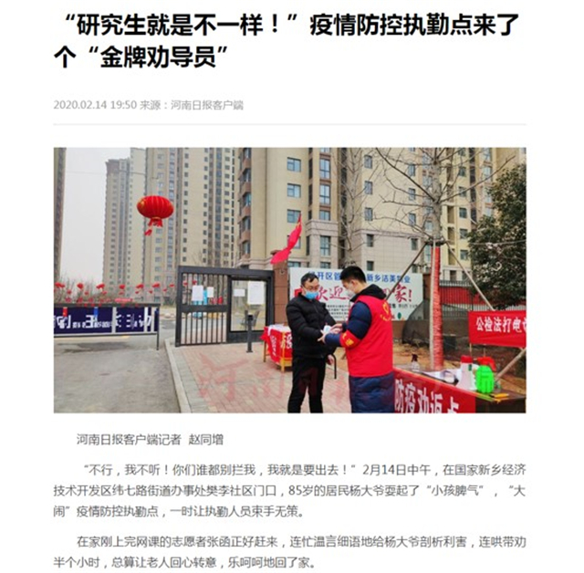 最初,他所在的社区群众不把疫情当回事,张函现场“连线”在武汉的同学“现身说法”,借机向社区群众普及防疫知识,成为了执勤点的“金牌劝导员”。这套“组合拳”发挥了大作用,春节期间,樊李社区再未出现扎堆聚餐、串门拜年的现象。他的做法得到社区工作人员的高度赞扬并在全区实施推广。他的事迹被河南日报等多家媒体宣传报道,樊庄村村委会委员王永霞竖起大拇指连连称赞:“张函出马,一个顶俩!”