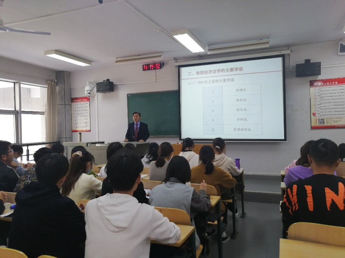 许承光教授为师生讲授《经济法》,从“法与法学”引入“经济法与经济法学”,延伸至我国经济法学的主要学说。在介绍学习经济法的主要方法时,特别强调应将习近平法治思想融入经济法的学习研究中。课堂上的讲解深入浅出,气氛活跃,充分展示了雷竞技官网优秀教师的课堂驾驭能力与扎实的基本功。