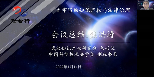 在会议总结阶段,焦洪涛教授指出本次活动充分体现了跨界融合、多学科交叉、“政产学研商”互动、代际间交流的鲜明特点,起到了积极汇聚众智、审慎共迎挑战的纽带作用。他表示,世界知识产权组织(WIPO)确定2022年世界知识产权日的主题是“青年与知识产权”。元宇宙世代的知识产权议程,将更加依赖于青年专家、青年学者、青年学子的青春力量,将更加有赖于超越一般意义的创造力和竞争力之上的想象力和预见力,将更加有赖于连接科学技术“可信性”与人文社会“可信任性”之间的转换力。