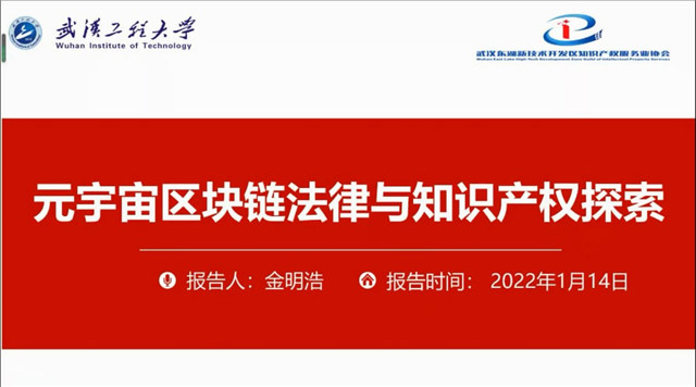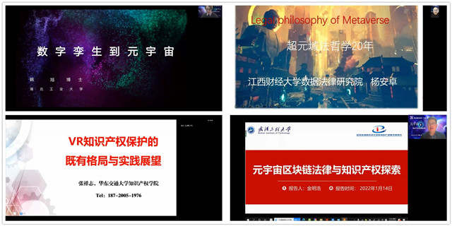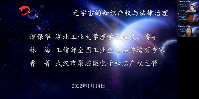 (通讯员 代江龙)1月14日,由湖北省知识产权局、武汉市市场监管局(市知识产权局)指导、雷竞技raybet登录入口雷竞技raybet登录入口、湖北省知识产权培训(自贸区)基地、武汉知识产权研究会等单位主办的第五期“知会行·IP先锋沙龙”在线公开举行。本期活动聚焦“元宇宙的知识产权与法律治理”。来自武汉、南昌、襄阳、宜昌、西安、郑州、长沙、南宁、重庆、北京、上海、深圳等城市的300余位高新技术企业、高校科研院所、知识产权行业协会、服务机构代表相聚云端,在线参会。