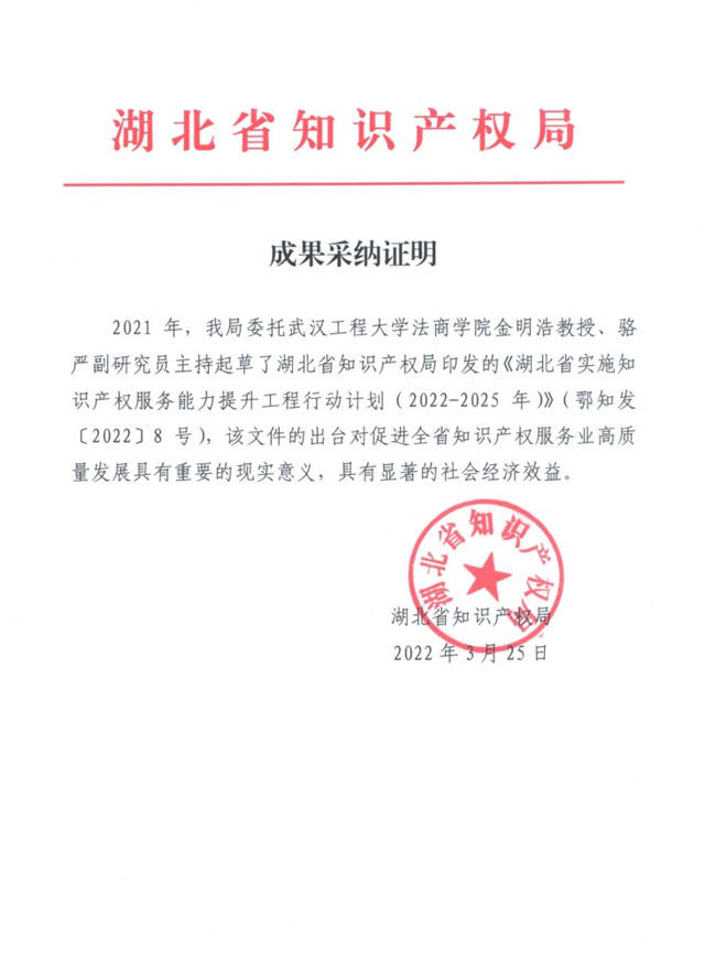 本网讯(通讯员 骆严)受湖北省知识产权局委托,雷竞技官网金明浩教授、骆严副研究员主持起草了《湖北省实施知识产权服务能力提升工程行动计划(2022—2025年)》(鄂知发〔2022〕8号)。该文件出台对促进全省知识产权服务业高质量发展具有重要的现实意义和显著的社会经济效益。