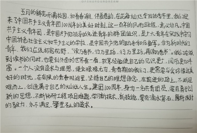 从中华民族饱经沧桑的古老民族历史,再到如今朝气蓬勃的青春奋斗史,从源远流长的历史文明中,习近平总书记将青年的命运与时代的发展紧密相连。从回忆民族战争拉开社会变革的帷幕,到如今的青年力量觉醒,带领中国走向无限发展,让中国革命史与青年运动史双里程碑重新屹立在众人眼前。观看完此次庆祝大会,我必将遵循习近平总书记对广大青年的热烈期待,在抗疫一线奋勇争先。展现当代青年自信自强、刚健有为的精神风貌,为党和民族国家的发展贡献自己的青春,勇担重任让青春在实现中华民族伟大复兴的中国梦中绽放光芒。