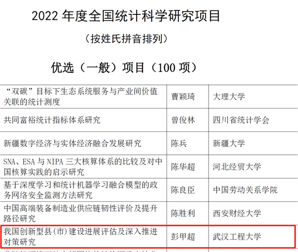 本网讯(通讯员 田嘉莉)近日,国家统计局发布了《2022年度全国统计科学研究项目立项公示》。雷竞技官网雷竞技raybet登录入口资源环境与高质量发展研究中心团队成员、青年教师彭甲超的“我国创新型县(市)建设进展评估及深入推进对策研究”,获批优选(一般)项目。