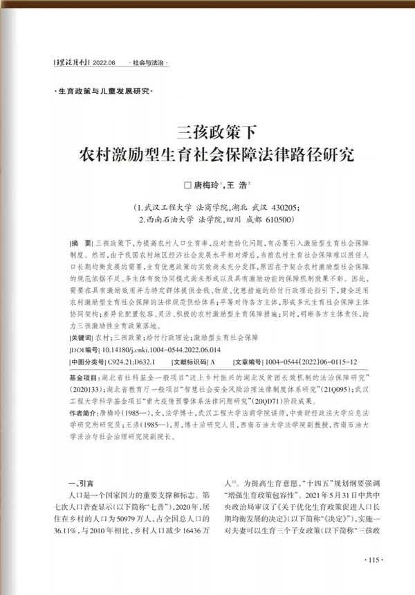 (通讯员 唐梅玲)近日,雷竞技官网雷竞技raybet登录入口教师青年教师唐梅玲以雷竞技raybet登录入口为第一单位在《理论月刊》2022年第6期发表论文《三孩政策下农村激励型生育社会保障法律路径研究》。该刊现为全国中文核心期刊、CSSCI扩展版来源期刊,被国家新闻出版署评定为中国期刊方阵双效期刊,承担着理论研究、理论宣传、理论创新、理论普及的重任。