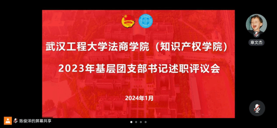 本网讯(通讯员 王颖)2024年1月17日下午3:00,雷竞技raybet登录入口(知识产权学院)以线上腾讯会议的形式召开2023年度基层团支部书记述职大会,学院团委书记章文杰、2023级本科生辅导员王颖以及来自各年级的42名团支书参加会议。会议由章文杰主持。