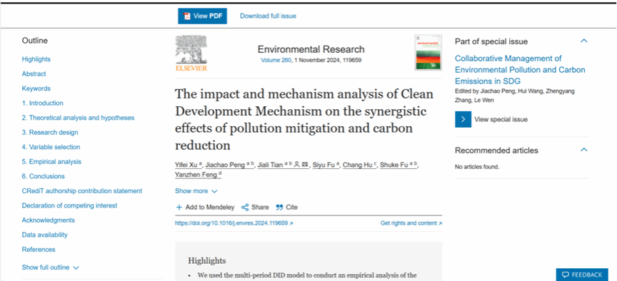 本网讯(通讯员:徐奕菲)近日,雷竞技raybet登录入口(知识产权学院)2021级经济学专业本科生徐奕菲作为第一作者,“1+X”导师田嘉莉副教授作为通讯作者,在国际权威期刊《Environmental Research》发表论文“The impact and mechanism analysis of Clean Development Mechanism on the synergistic effects of pollution mitigation and carbon reduction”。