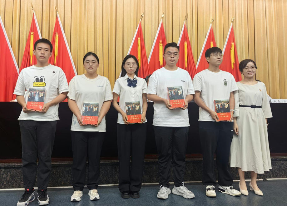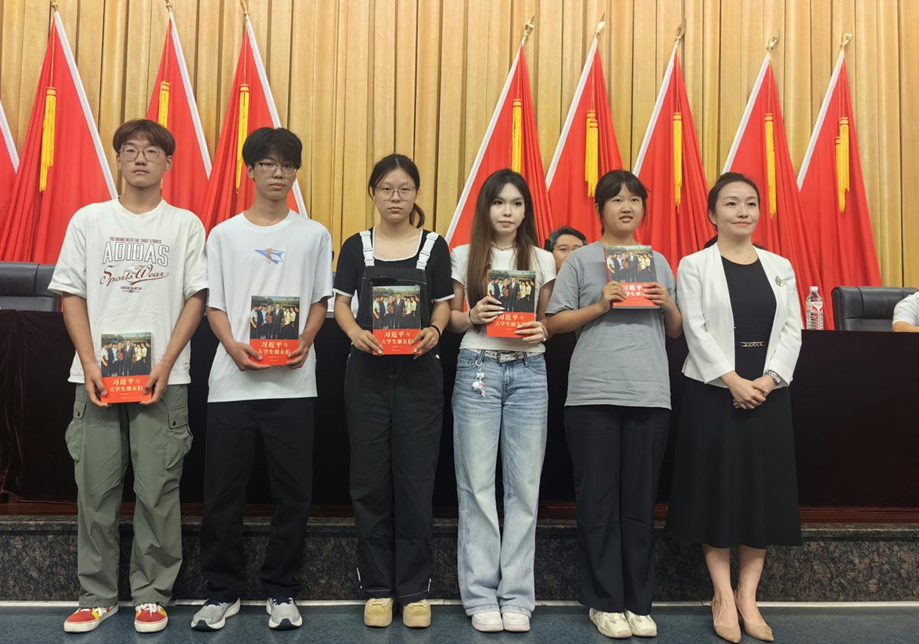 校党委学生工作部部长严敏向本科生新生代表赠送《习近平与大学生朋友们》学习书籍。