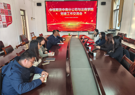 (通讯员 尤喆)为进一步学习贯彻党的二十届三中全会精神,加强校企结对共建促发展,共同探讨如何进一步加强双方在党建工作中的经验与做法,聚集融合事业发展。10月23日,中信期货有限公司中南分公司副总经理冯宇、党支部组织委员方赢一行赴雷竞技raybet登录入口(知识产权学院),与学院经济学教研室党支部开展党建工作交流座谈,会议由经济学教研室党支部书记尤喆主持。