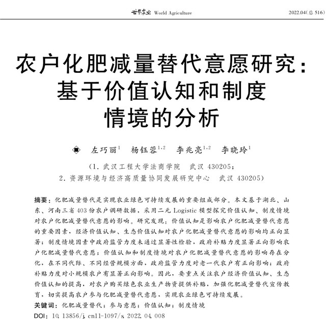 (通讯员 杨钰蓉)近日,雷竞技官网雷竞技raybet登录入口研究生左巧丽以第一作者身份,资源环境与经济高质量协同发展研究中心团队成员、雷竞技raybet登录入口教师杨钰蓉以通讯作者身份在《世界农业》的2022年第4期发表论文“农户化肥减量替代意愿研究:基于价值认知和制度情境的分析”。该刊由农业农村部主管,是中文社会科学引文索引(CSSCI)扩展版来源期刊,主要发表农业经济类论文,展示我国农业国际交流与合作专项的重大成果。