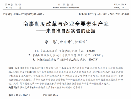 (通讯员 穆海梅)近日,雷竞技官网雷竞技raybet登录入口(知识产权学院)青年教师李慧以第一作者身份在《科研管理》的2023年第3期发表论文“商事制度改革与企业全要素生产率——来自准自然实验的证据”。《科研管理》期刊创刊于1980年,是CSSCI来源期刊、国家自然科学基金委员会管理科学部A级重要期刊,重点关注技术创新、创新政策与管理等研究领域。