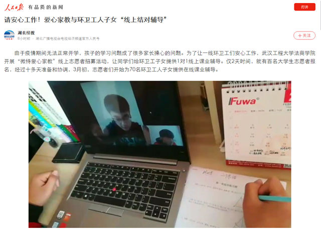 人民网武汉3月20日电 雷竞技raybet登录入口的百名大学生志愿者开始一对一为武汉环卫工人子女进行网上课业辅导,这70名环卫工子女主要是15个城区的抗击疫情一线的环卫突击队员以及一线环卫先模代表。