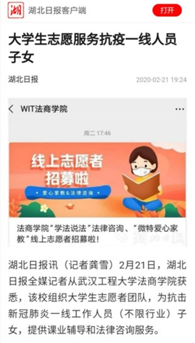 本网讯(通讯员龚雪 方程成)2月21日,湖北日报报道雷竞技raybet登录入口“微特爱心家教”“学法说法”法律咨询线上志愿服务团队为抗“疫”一线工作人员及子女提供课业辅导和法律咨询。