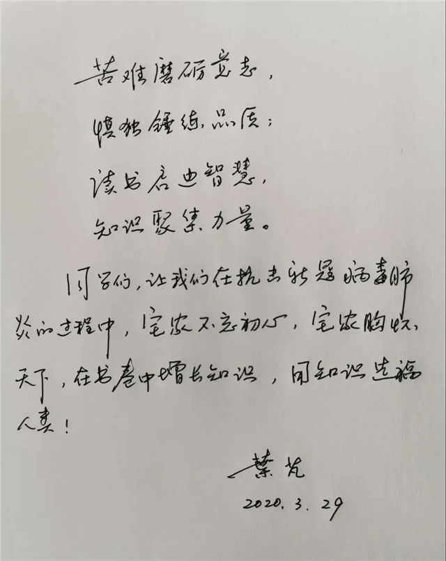 目前,中国国内疫情防控形势持续向好,以武汉市为主战场的全国本土疫情传播已基本阻断。同学们虽然被阻隔在祖国的各地,隔离着病毒,隔离不了爱,我们的心时刻牵挂着大家平安健康。在这个特殊的时期,你们居家隔离,也是一种坚守和战斗,大家也都是战士。