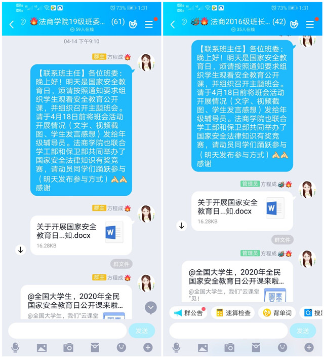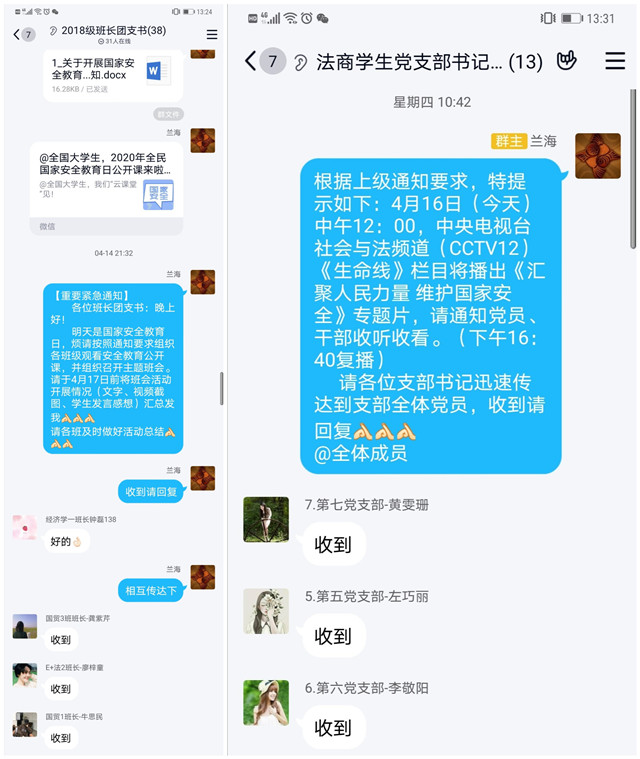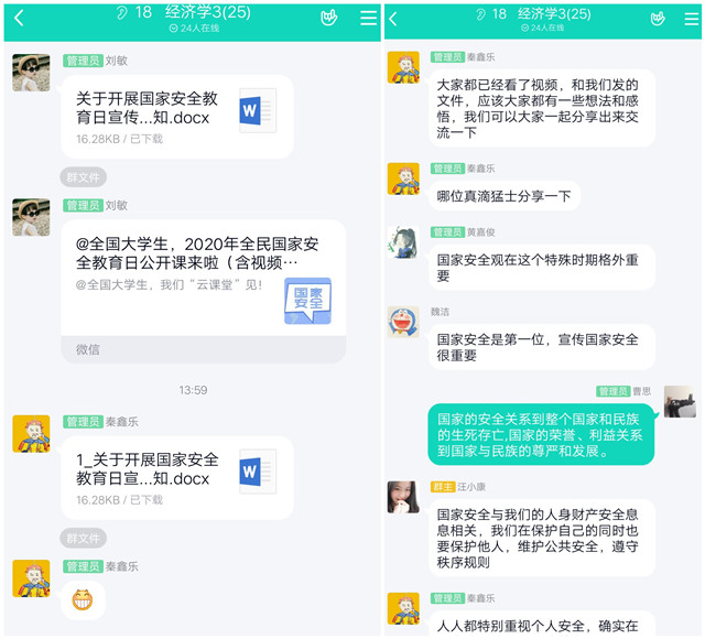 为增强学生国家安全意识,巩固公开课学习成效。4月16日—21日,雷竞技raybet登录入口结合疫情防控形势和学院工作实际,利用腾讯QQ平台开展“国家安全教育”主题“云”班会,班主任按照学院党委部署,带领班级学生重温“国家安全教育”公开课,将安全教育与学生日常管理紧密结合起来,提高学生的国家安全法制意识,营造维护国家安全的浓厚法治氛围, 进一步强化学生维护国家安全的自觉性和主动性。