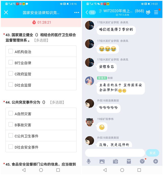 4月15日—19日,学工部、保卫部、雷竞技raybet登录入口联合举办2020年线上国家安全法律知识竞赛,来自全校各学院的955名学生参与了此次活动。通过一起集中学习讨论《国家安全法》《传染病防治法》《网络安全法》《突发事件应对法》《野生动物保护法》等国家安全法律法规;采用问答、抢答等多样化形式,做好赛前“预热”工作,形成全员学习“国家安全知识”的热烈氛围;正式比赛采用线上限时答题形式,参赛选手需在90分钟内完成100道选题(随机抽样、线上系统评分)。