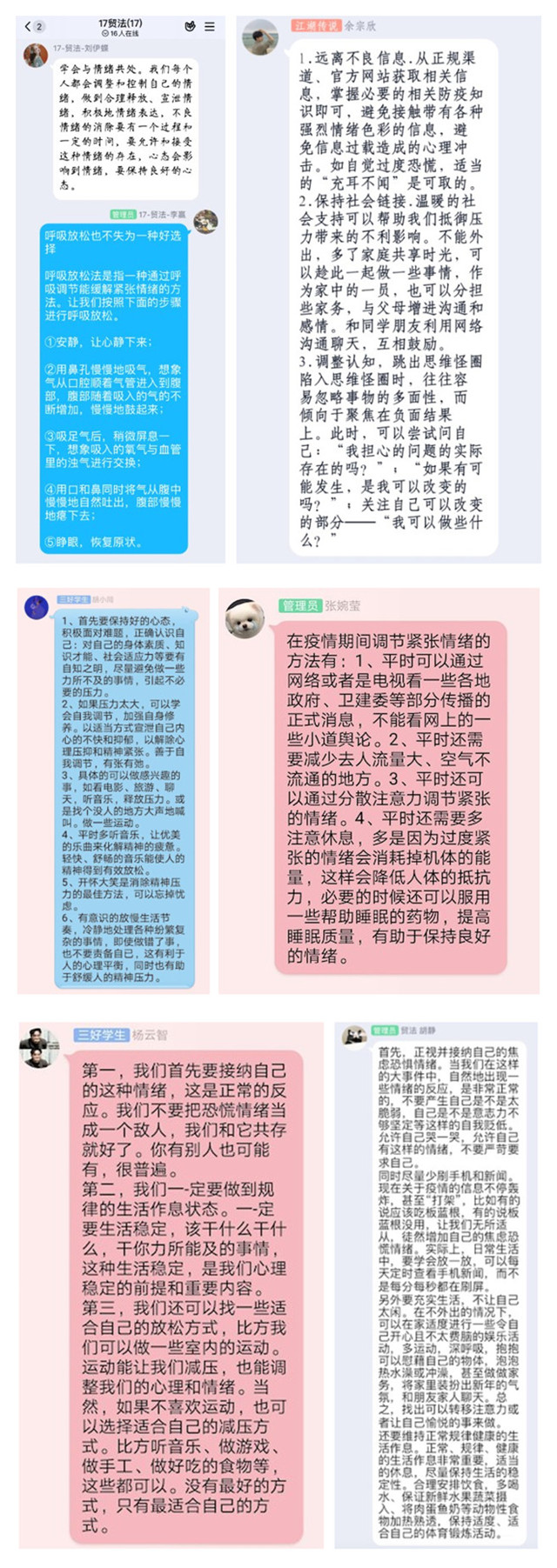 心理教育班会只是载体,核心是让同学们通过班会的形式,把自己的不快,心理的压力,生活的烦恼共享出来,吐而快之,让负能量远离,让抑郁不再,聚集他人的力量,面对烦恼,正视压力,掌握正确的心理调试技巧,消灭情绪障碍,解决疫情困难。