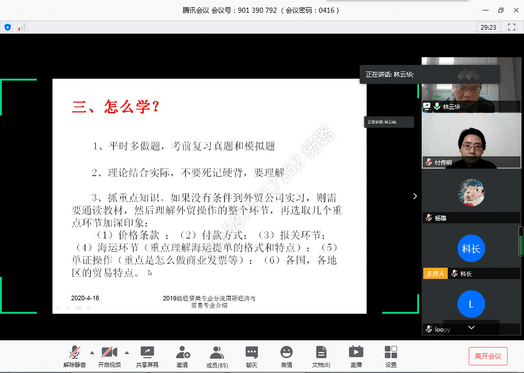 (通讯员:杨璐)疫情期间,为保证2019级本科学生专业分流工作的稳步推进,让各位同学对选报专业有更清楚的认识,雷竞技raybet登录入口于4月16日下午通过腾讯会议平台组织开展了“2019级专业分流线上宣讲会”,雷竞技raybet登录入口院长金明浩、副书记严敏、院长助理付书科、经济学教研室主任张艳、国际经济与贸易教研室主任付传明、经济学教研室韩可卫教授、国际经济与贸易教研室林云华、周灏教授、部分班主任和19级全体经贸大类同学参加了此次会议。